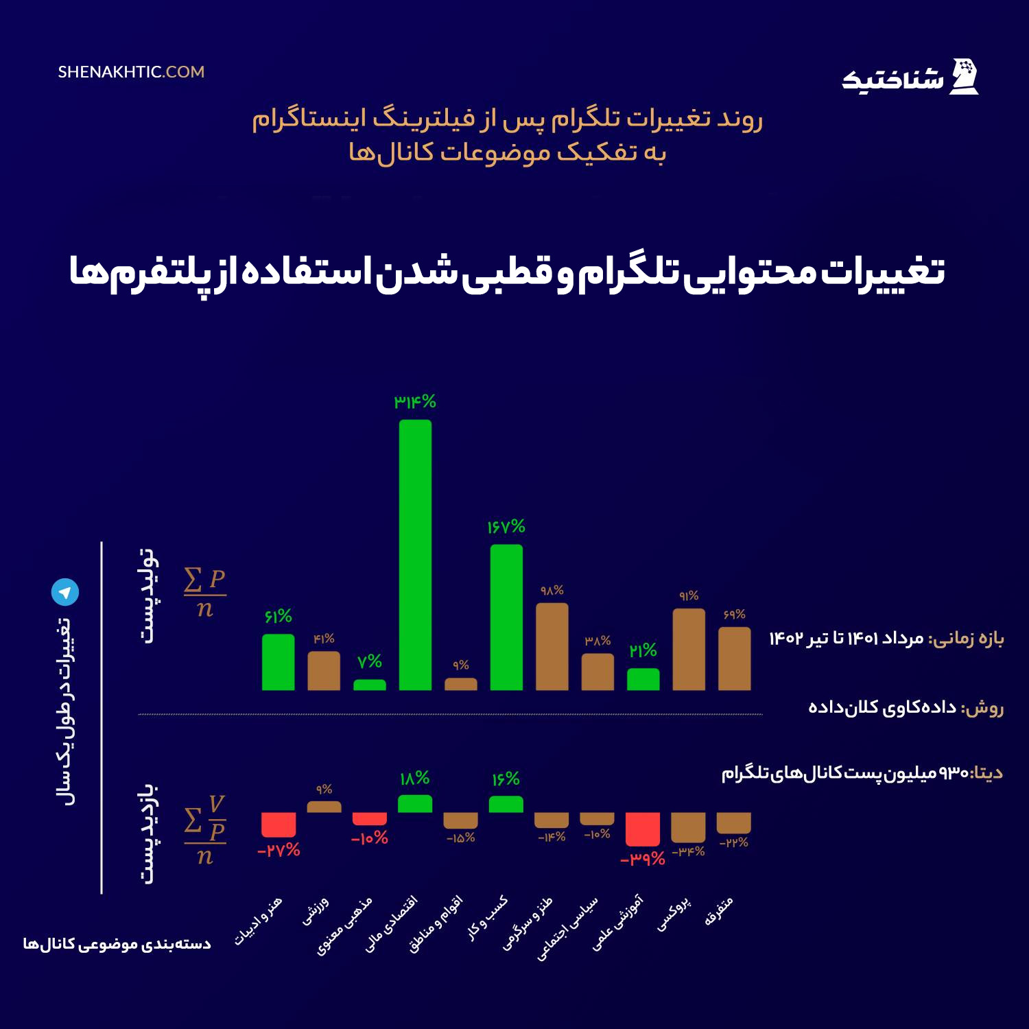 بیشترین افزایش پست‌گذاری، مربوط به موضوعات اقتصادی (۳۱۴ درصد)، کسب و کار (۱۶۷ درصد) و طنز و سرگرمی (۹۸ درصد) است.