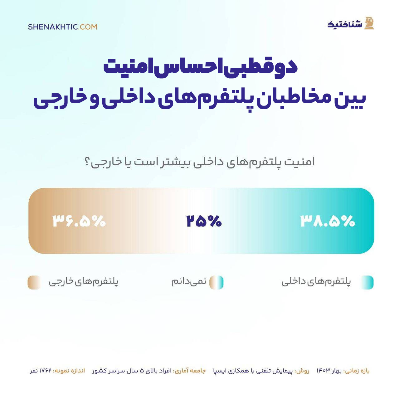 ۳۸.۵ درصد کاربران، پلتفرم داخلی و ۳۶.۵ درصد، پلتفرم خارجی را امنتر میدانند؛ لذا میتوان گفت تعریف کاربران و احساس آنها از امنیت در دو قطب متقابل قرار گرفته است!